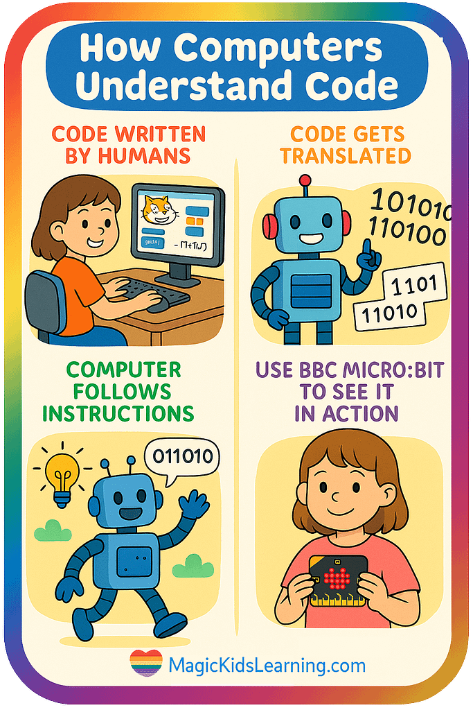As a homeschooling mum and educator, I love seeing those lightbulb moments when kids realise that coding isn’t just about tapping buttons on a screen – it’s about communicating with a computer and watching it respond. But one question often comes up: “How do computers understand code?”